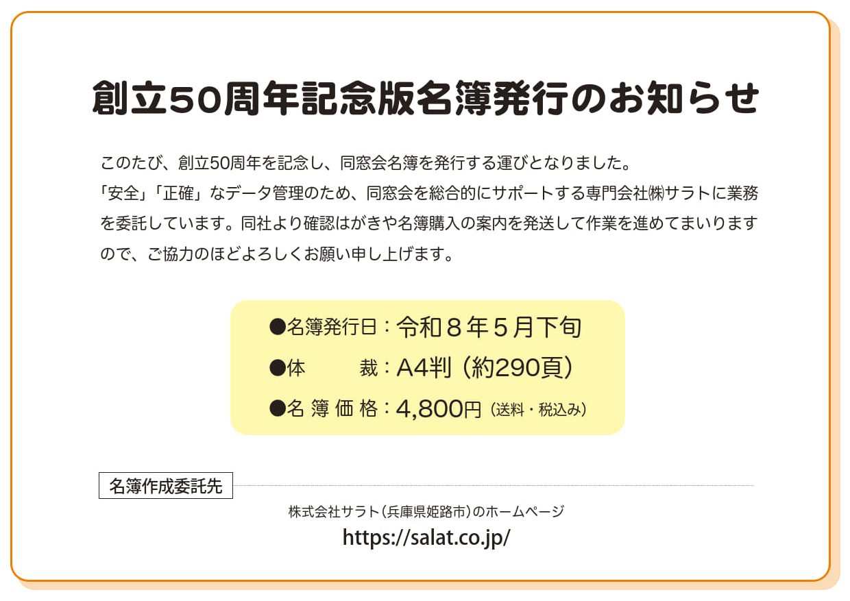 | 8、9、18、19、28、29、38、39期生には、総会の案内ハガキをお送りいたしますので、ハガキのQRコードから出欠をお知らせください。9月末までにハガキが届かない場合は、「会員異動通知」から現住所等の連絡をお願いします。 |